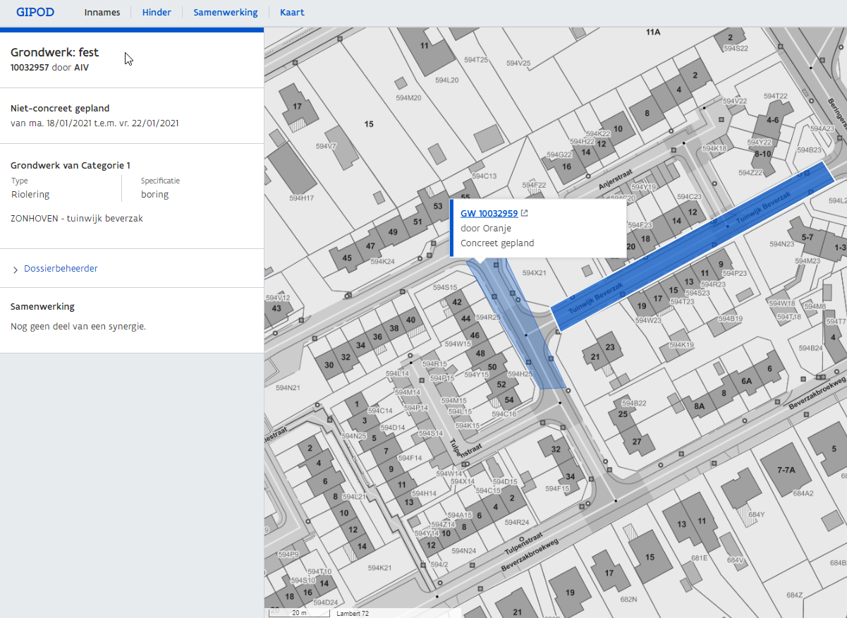 In volgend screenshot worden de contextdata in lichtblauw getoond, in dit geval is dit een grondwerk. Door op de lichtblauwe zone te klikken wordt de pop-up getoond. Door op het pijltje naast het GIPOD-ID te klikken opent het detailscherm van het grondwerk zich in een nieuw tabblad van je browser.