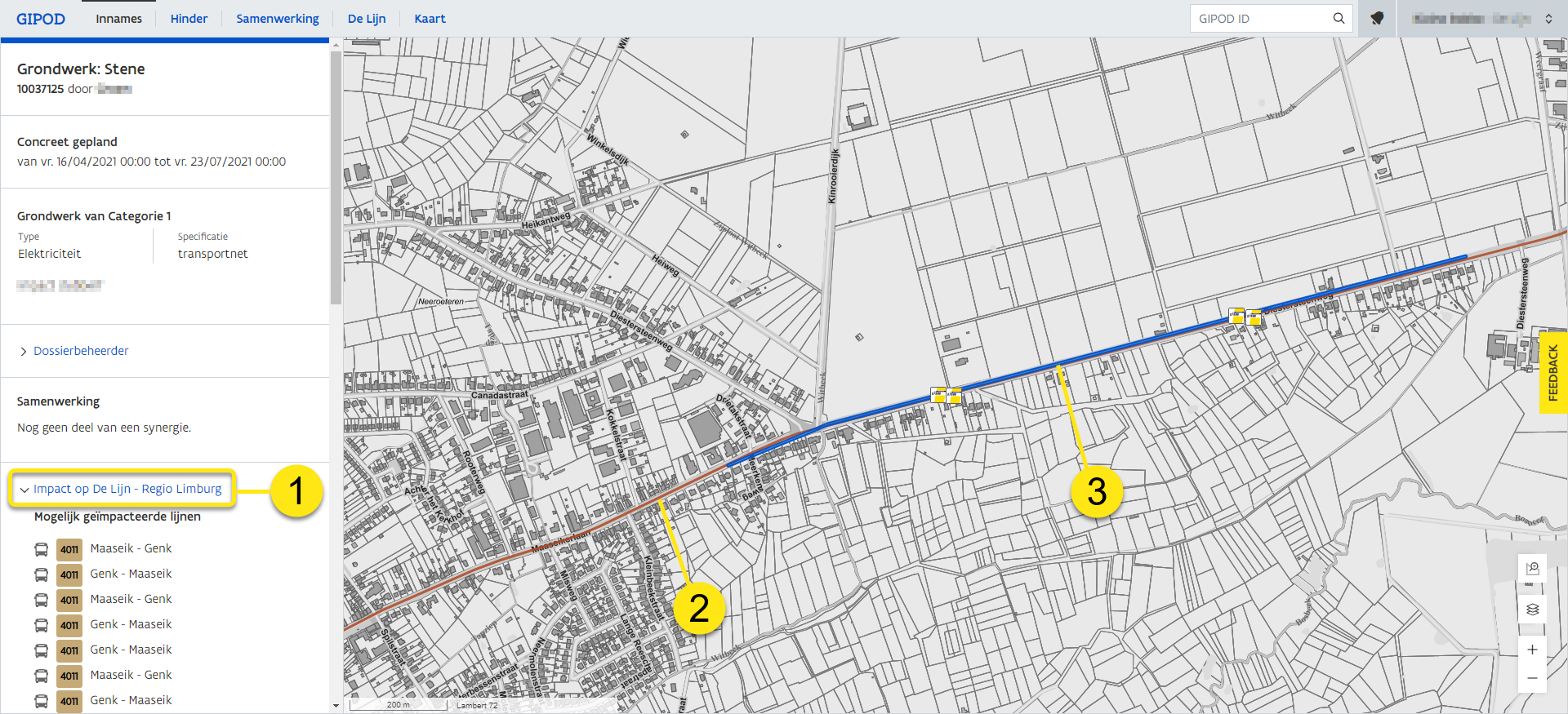 Wanneer het menu Impact op De Lijn is opengeklikt (1) verschijnen de routes van de lijn (2). De inname (3) die ook op de kaart te zien is, maakt duidelijk dat er een impact is voor deze route en haltes.