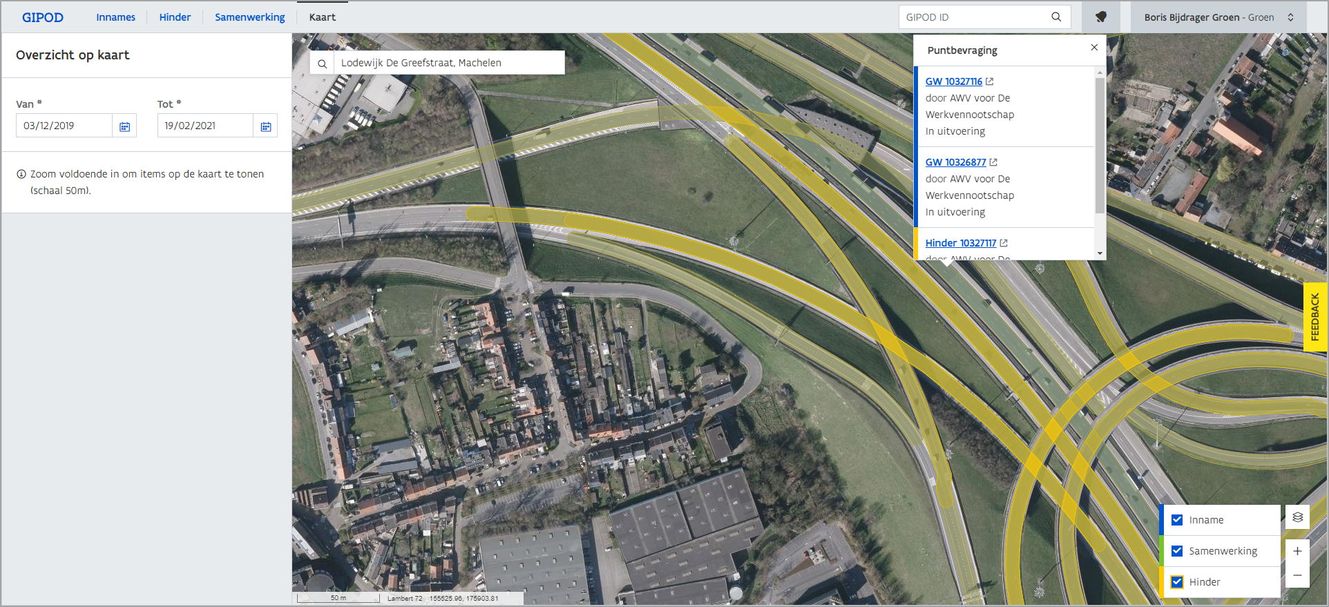In volgend voorbeeld zie je alle contextdata voor de periode van 03/12/2020 tot 19/02/2021 in de buurt van de Lodewijk De Greefstraat in Machelen. Door op de contextdata te klikken krijg je een overzicht van de innames, samenwerkingen en/of hinder die zich op dat punt bevinden. Hierbij wordt GIPOD ID, Beheerder en Status getoond.
