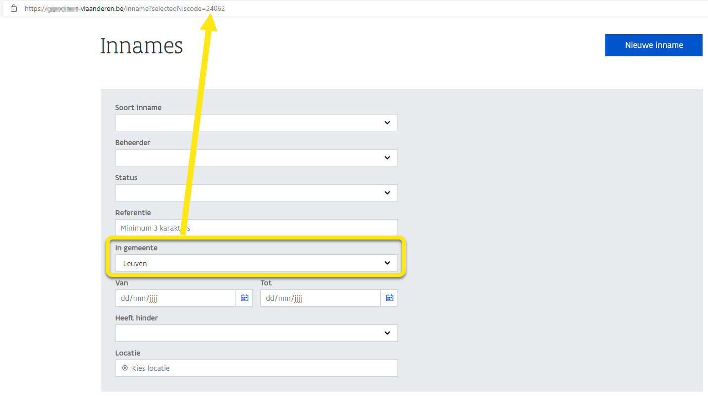 Je wilt innames standaard filteren op de gemeente Leuven. Na het instellen van Leuven als gemeente verschijnt ‘selectedNiscode=24062’ in de url, de technische verwijzing naar de gemeente Leuven. Open je de (volledige) url opnieuw, dan zal Leuven meteen als filter ingesteld staan bij het criterium In gemeente.