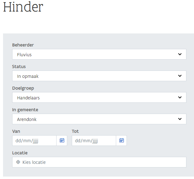 De filtercriteria In gemeente, Heeft hinder en Locatie zijn niet zichtbaar in de video, maar zijn intussen toegevoegd.