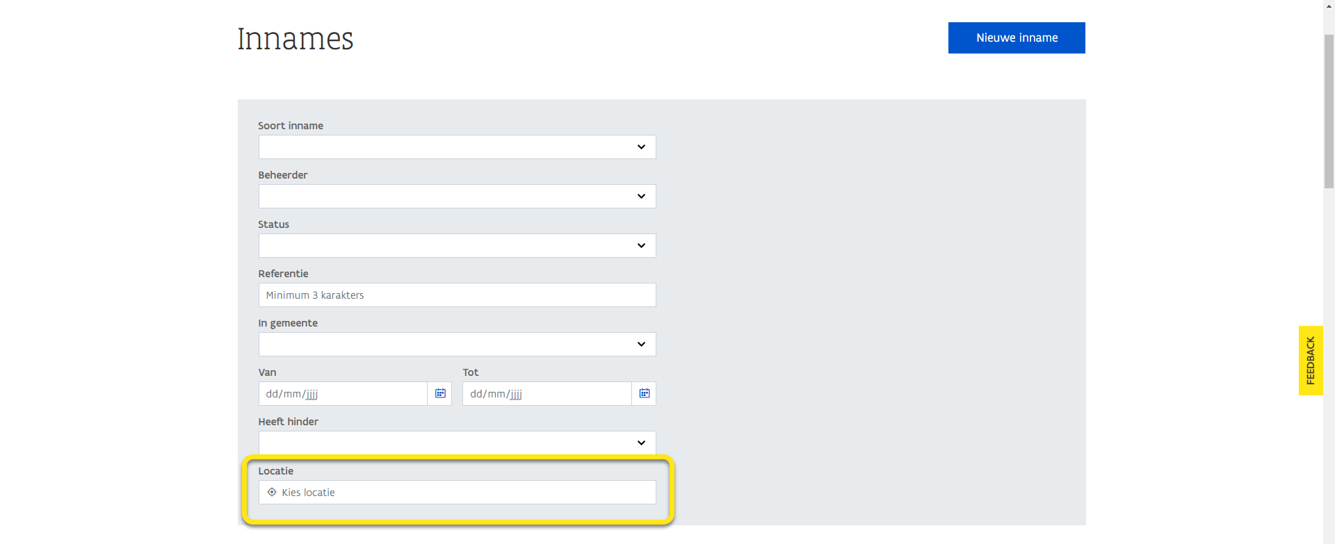 Deze functionaliteit werkt voor alle filtercriteria, dus zowel bij Innames als bij Hinder en Samenwerking.