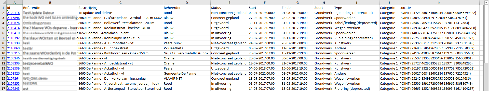 GIPOD ondersteunt het exporteren (downloaden) van zoekresultaten. Onderaan elke pagina met filters (Innames, Hinder, Samenwerking…) staat de knop Download. Door erop te klikken download je een Microsoft Excel-bestand met de (al dan niet gefilterde) resultatenlijst.